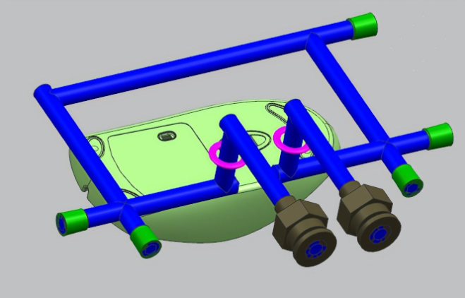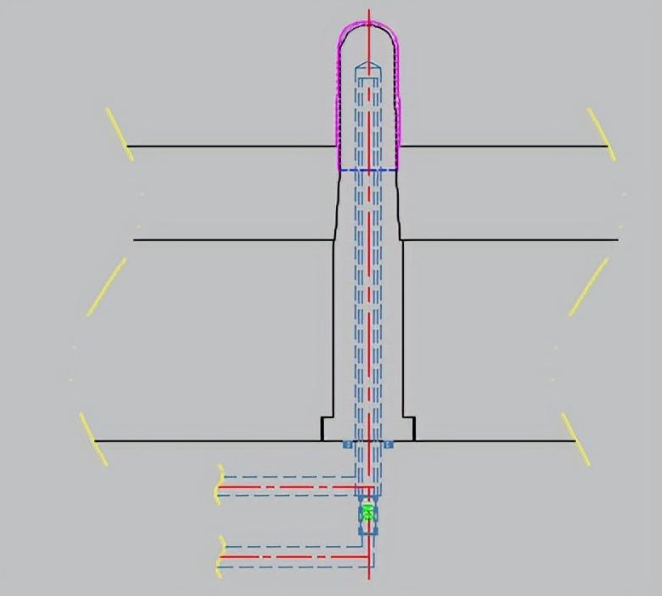 3、有些產品高低落差很大,導致回字形水路無法達到冷卻的效果,此時通常采用普通運水加水井冷卻的方式,如下圖所示: