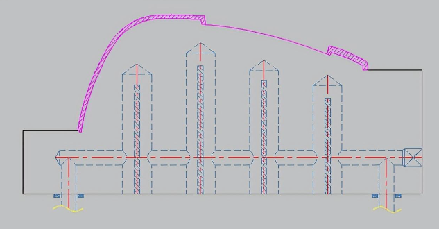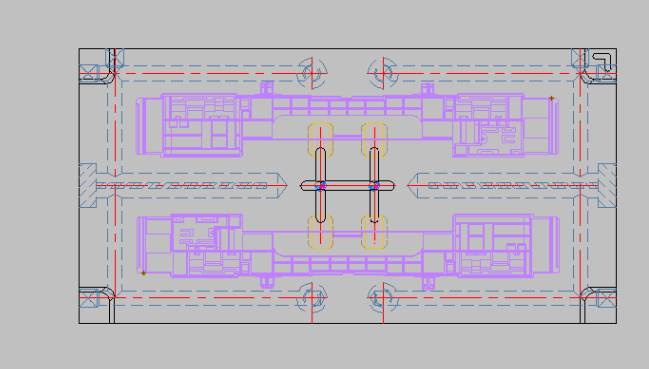 2、對于高低落差小,但是長度方向較長的產品,采用回字形水路中間加水井冷卻的方式,如下圖所示: